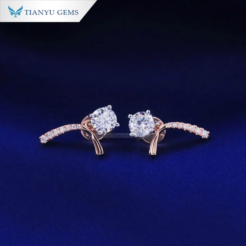 Bow-shaped colorless moissanite earrings with a bow-shaped 14k rose gold metal bar partially set with small diamonds and extending outward with larger sparkling round-cut colorless moissanite diamonds, a unique and beautiful design.