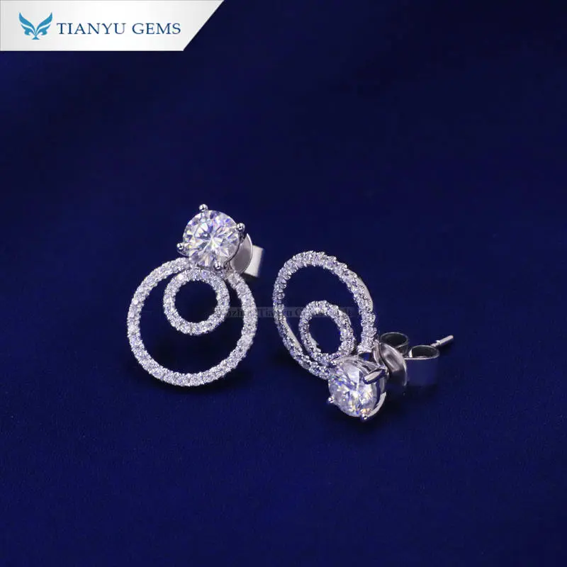 Gentle double circle moissanite 10K white gold diamond stud earrings with diamond set size circles interlocked with round cut moissanite accents to maximize the brilliance and radiance of the earrings.