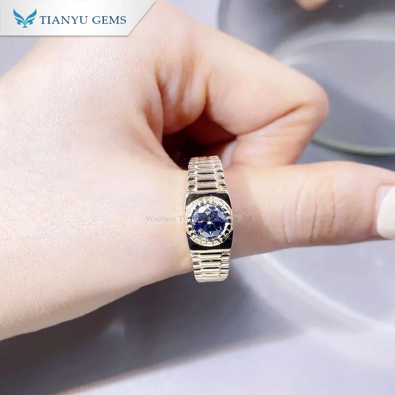Custom 14K white gold wedding band round hearts and arrows cut blue sapphire corundum male ring