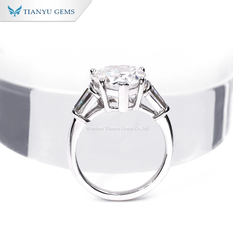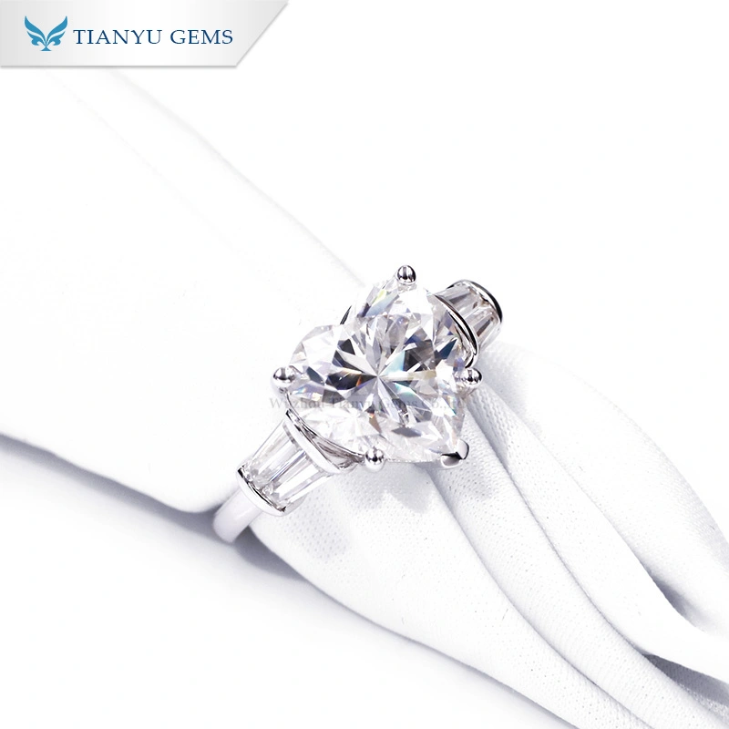 Popular 14K white solid gold 10mm*1 pcs heart brilliant cut and 5.2*1.5*2mm*2pcs trapezoid cut DEF color vvs white moissanite classic three stones engagement ring.