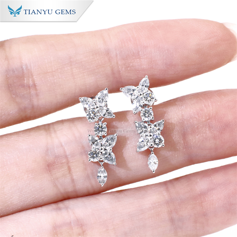 These 14k white gold dangle earrings feature colorless marquise-cut and round-cut moissanite that combine in a geometric pattern for a novel and intriguing style.