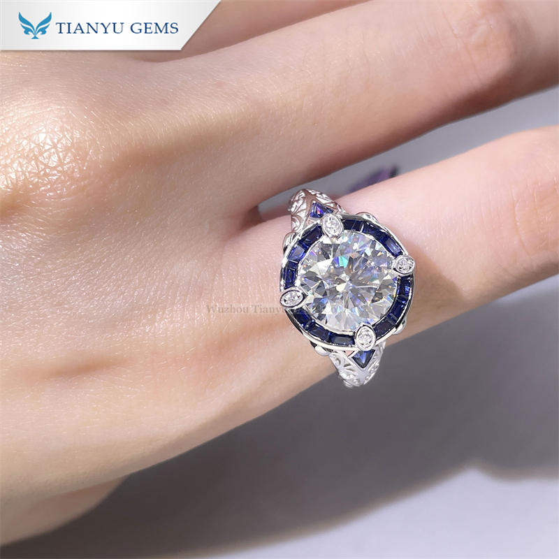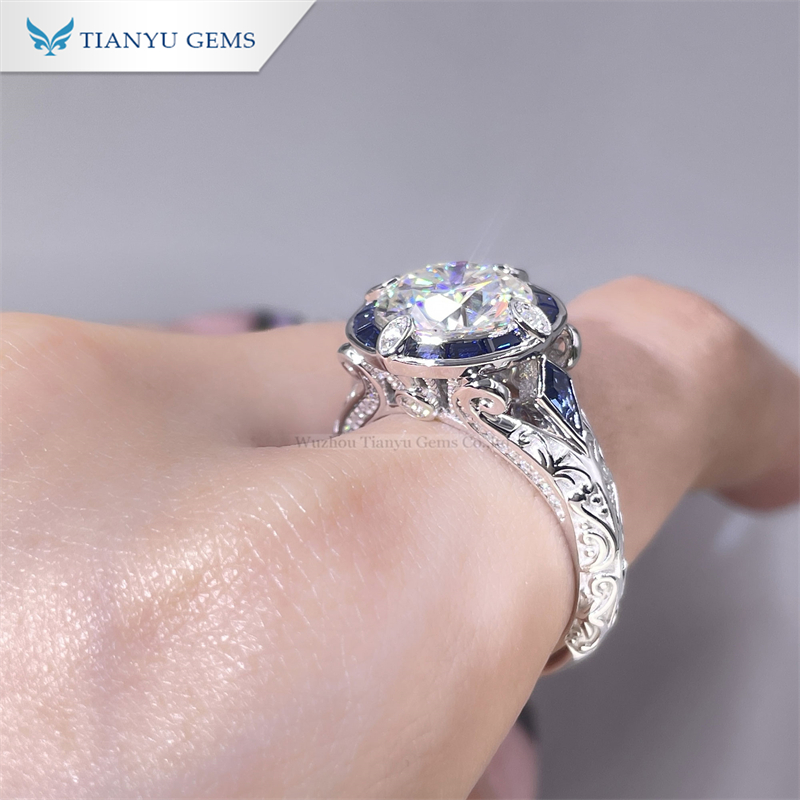 This ring features round, emerald, pear, and horse's eye cuts, with a 9.5mm white moissanite as the main stone, set off by blue stones of different sizes and scratches, and hand-engraved and sawn piping details to give this eye-catching 18k platinum diamond engagement ring a vintage look.