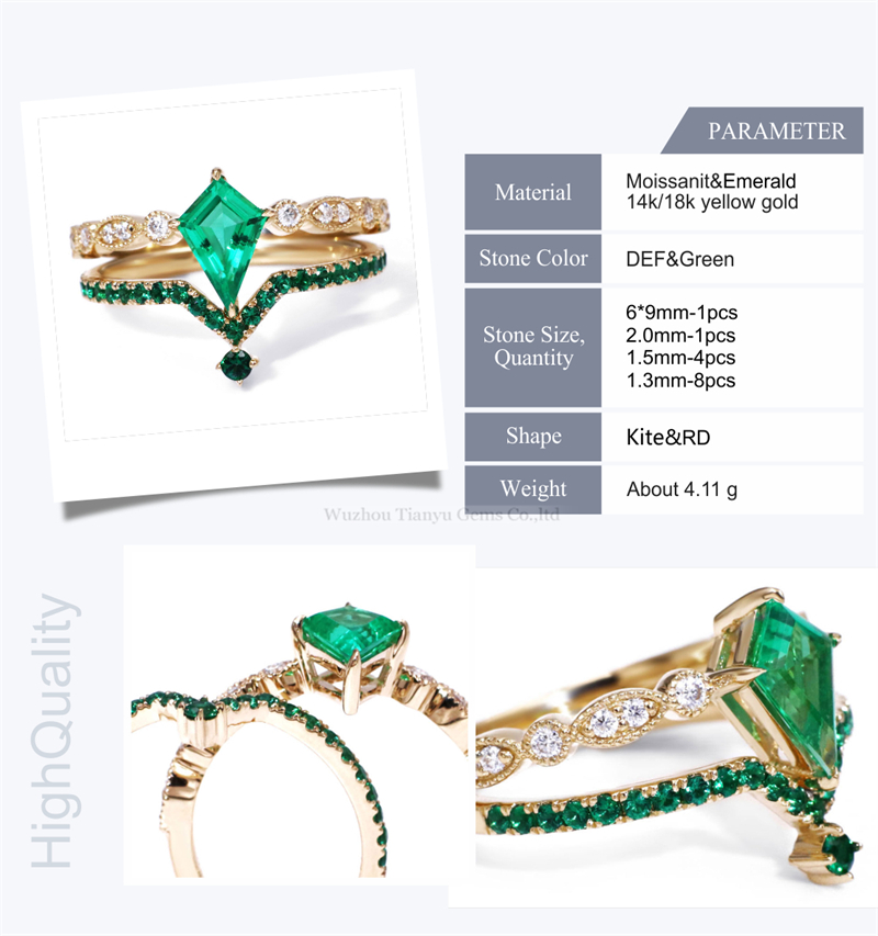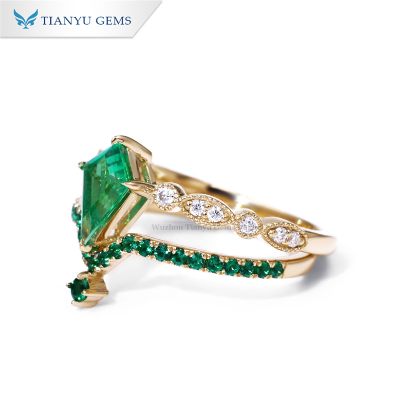 Emerald V-shaped special 14k gold ring set