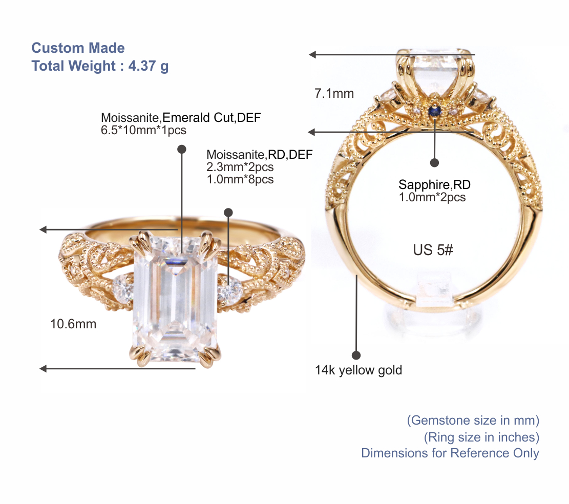 Discover the beauty of timeless elegance with our Custom Made 7.5*10mm Emerald Cut Moissanite Ring. This exquisite piece, crafted from 14k solid yellow gold, showcases a D VVS1 moissanite that promises unparalleled brilliance and sophistication. Designed for women who appreciate classic jewelry with a modern twist, this ring is a perfect symbol of grace and luxury.