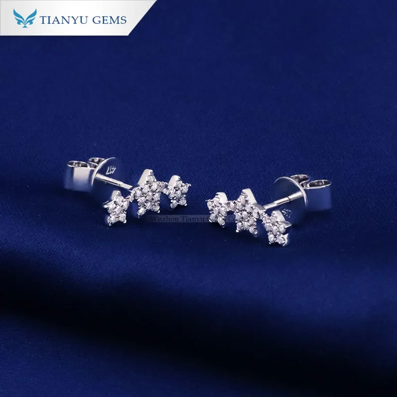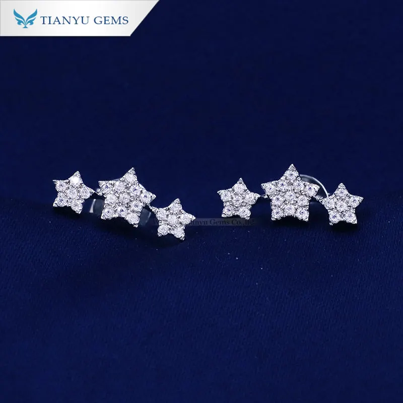 Star-studded earrings, each earring has three pieces of metal in the shape of a diamond-studded star, with a thin strip of white gold connecting the three pieces of star metal.