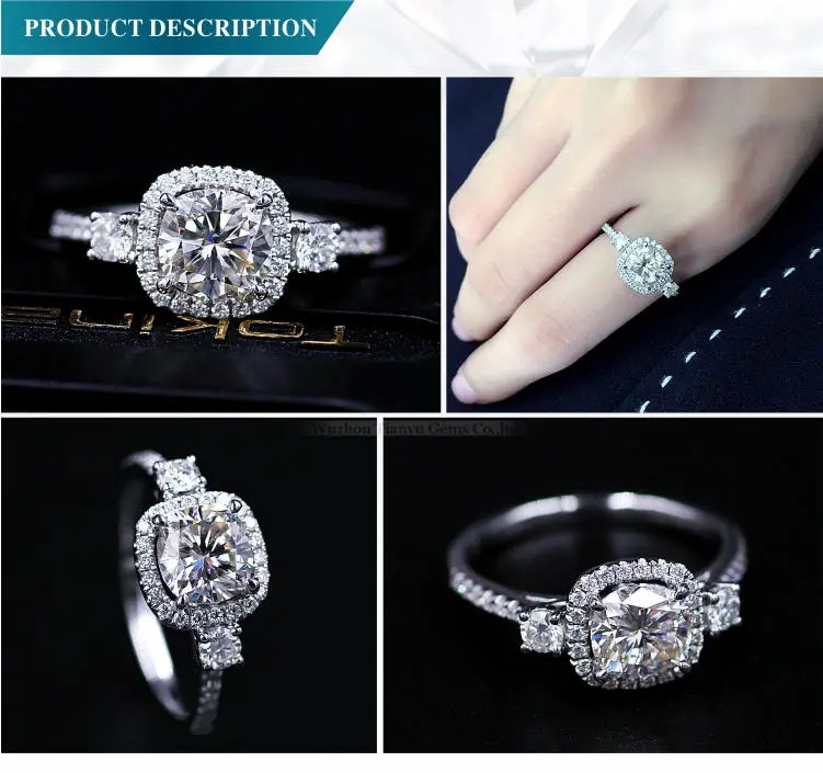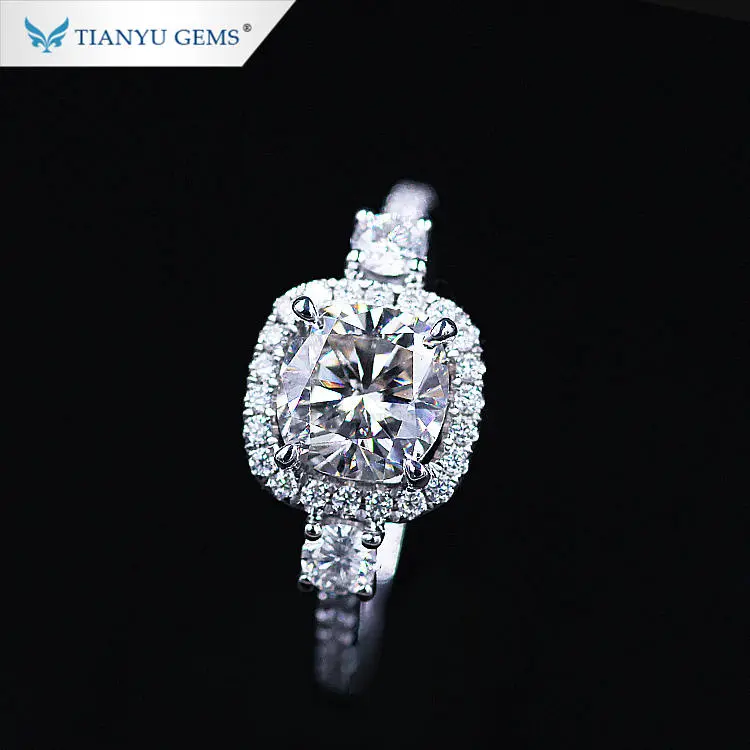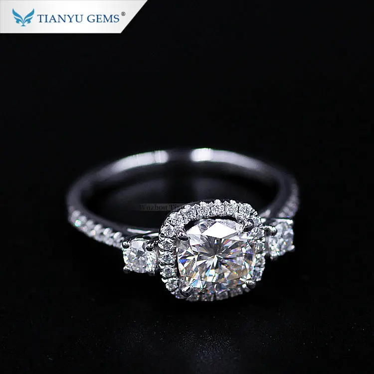 Tianyu Gems real fine gold jewelry 14k solid white gold 3 stones cushion halo diamond moissanite engagement ring