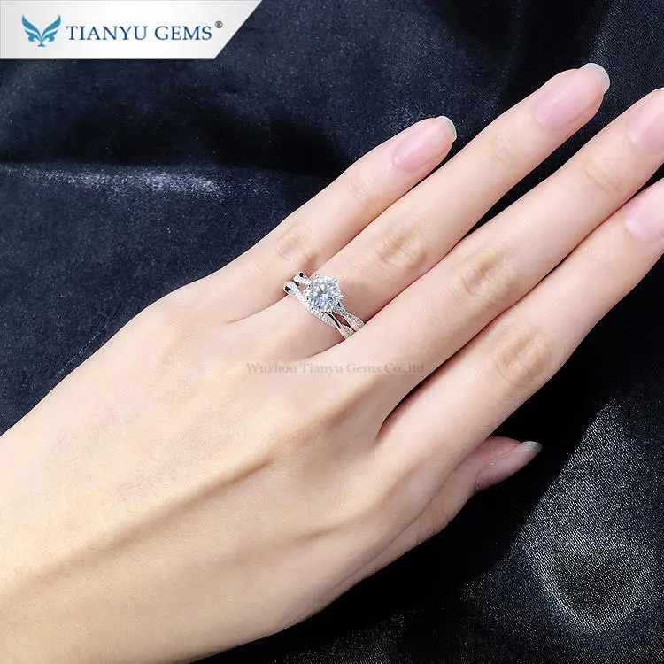 Tianyu Gems customized 14k white gold 1ct round heart&arrow colorless moissanite cross ring set for ladies