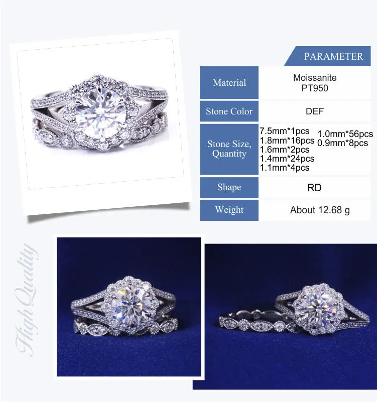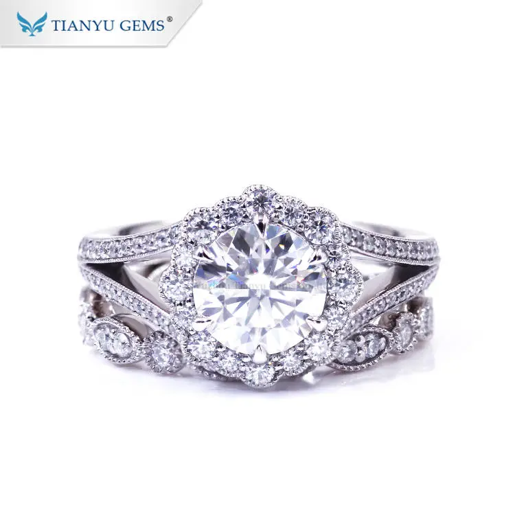 Tianyu Gems customized PT950 white gold 1.5ct round heart&arrow colorless moissanite ring set for ladies