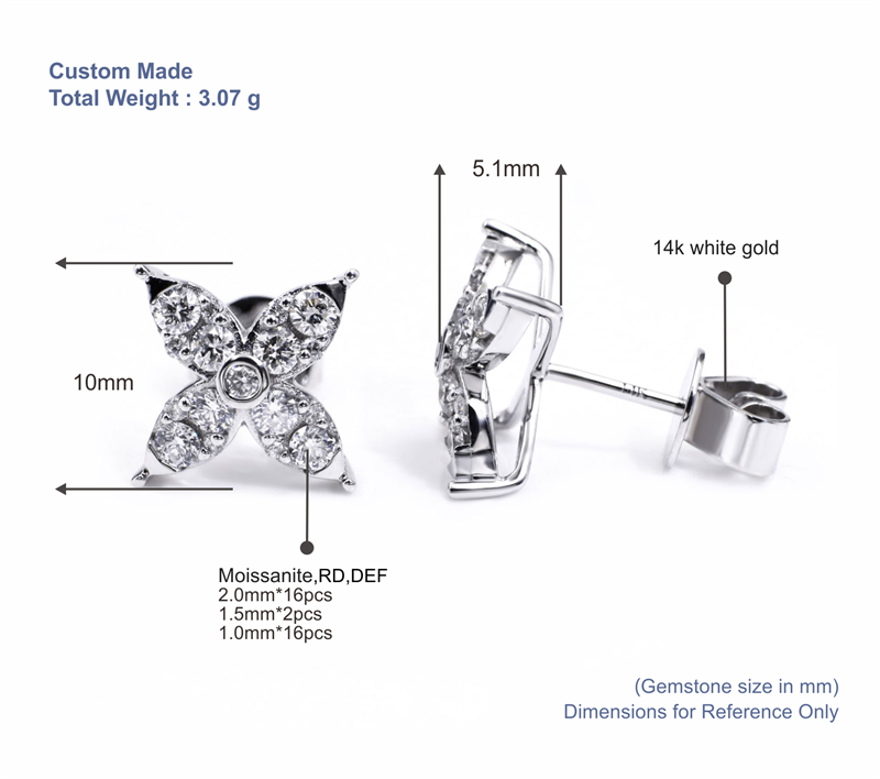 Indulge in the timeless allure of the 14K White Gold Round Cut Moissanite Diamond Four Leaf Clover Design Stud Earrings, meticulously crafted to adorn the ears of sophisticated women. These earrings are more than just accessories; they're symbols of luck, elegance, and impeccable style. With their delicate four-leaf clover design and sparkling moissanite diamonds, they exude charm and sophistication, making them the perfect choice for any occasion.
