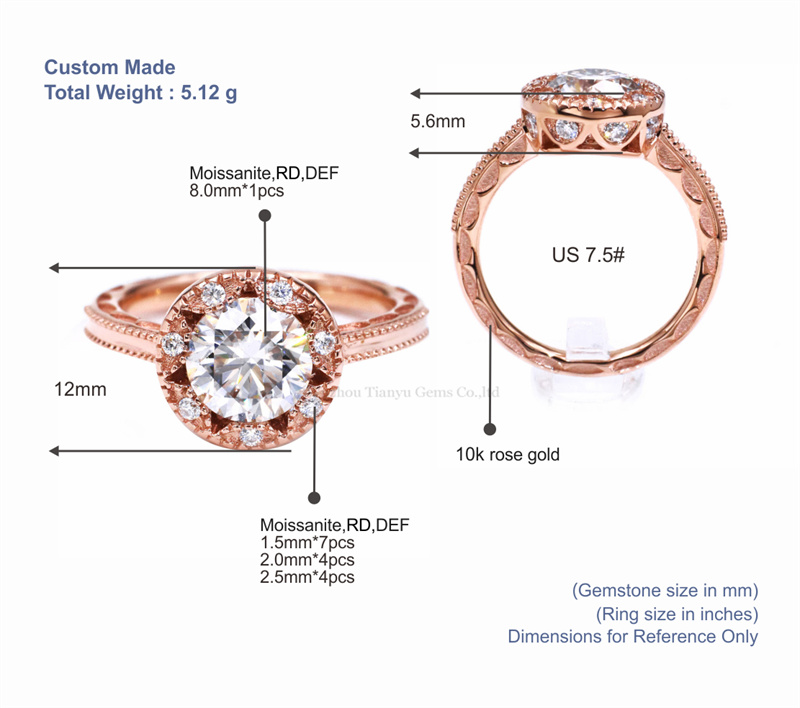 Main Stone  8.0mm-1pcs  1.5mm-7cps  2.0mm-4pcs  2.5mm-4pcs Moissanite